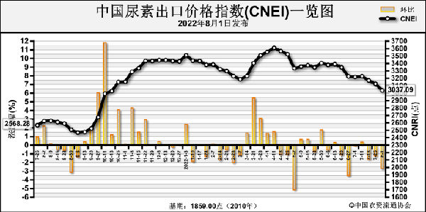 8月1日中國尿素出口價格指數(shù)(CNEI)為3037.09點,環(huán)比下跌88.96點,跌幅為2.85%;同比上漲412.85點,漲幅為15.73%;比基期上漲1178.09點,漲幅為63.37%。